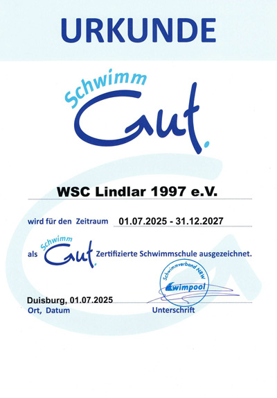 Der WSC Lindlar erfüllt alle erforderlichen Kriterien, wie zum Beispiel qualifizierte, regelmäßig fortgebildete Übungsleiter, kleine Teilnehmerzahlen in den Schwimmgruppen oder eine planmäßige und zielgerichtete Schwimmausbildung.